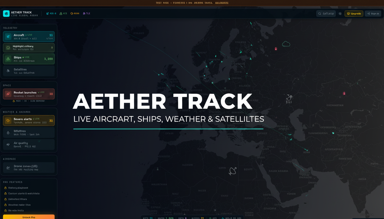 PASSION PROJECTS GLOBAL RADARAETHERTRACKAether Track provides live radar tracking for aircraft, ships, satellites, and severe weather.(Built with Lovable)